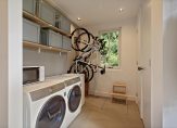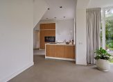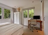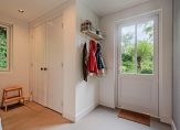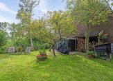 Achter de keuken bevindt zich de aanbouw met praktische berging, waarin de wasvoorzieningen en warmtepomp netjes zijn weggewerkt, evenals een stijlvolle slaapkamer met en-suite badkamer. Deze ruimte biedt rust, comfort en directe toegang tot de voortuin – ideaal voor gasten of gelijkvloers wonen.