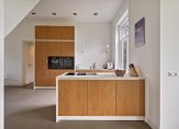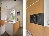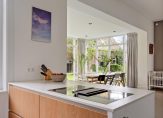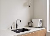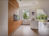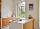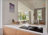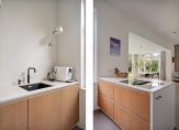 De open keuken, rijk uitgerust met onder meer Gaggenau apparatuur, een Quooker en luxe werkbladen, is het hart van het huis. Koken is hier geen handeling, maar een ritueel – terwijl u uitkijkt over het water, waar soms een bootje voorbij glijdt in het avondlicht.