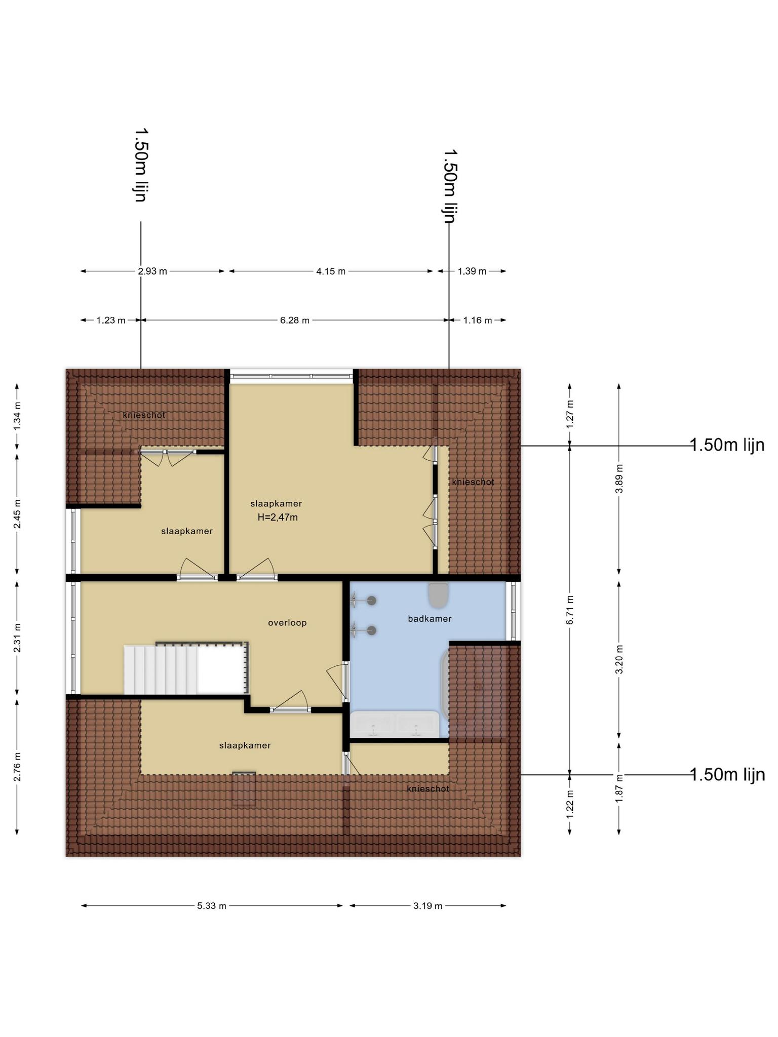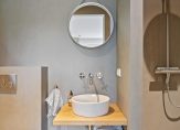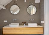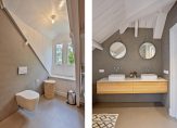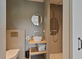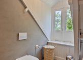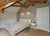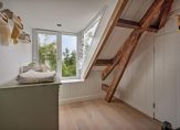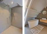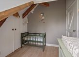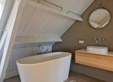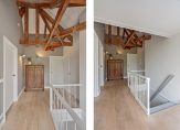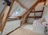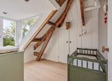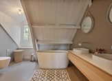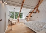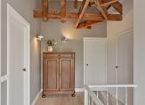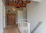 De overloop op de eerste verdieping ontvouwt zich onder een adembenemende balkenconstructie – een architectonisch eerbetoon aan het verleden. Hier bevinden zich drie sfeervolle slaapkamers, een berging en een royale badkamer die aanvoelt als een privésanctuarium: dubbele stortdouches, een losstaand ligbad, Houtmerk-meubilair en een uitzicht dat elke ochtend een glimlach brengt.