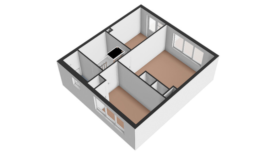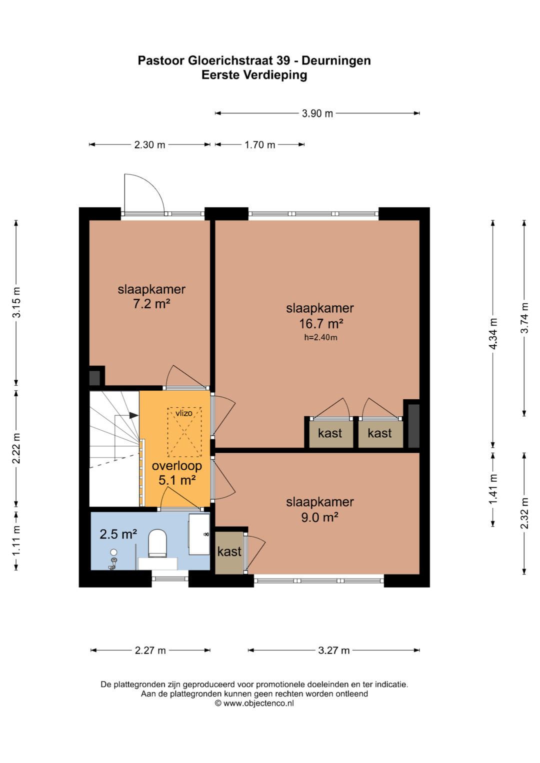 Overloop, badkamer, drie slaapkamers en een vlizo trap naar de tweede verdieping. De slaapkamers meten afgerond 17, 9 en 7 m². Twee slaapkamers hebben de beschikking over vaste kastruimte.