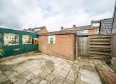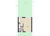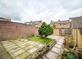 Diepe voortuin en een zonnige achtertuin voorzien van stenen schuur en achterom.