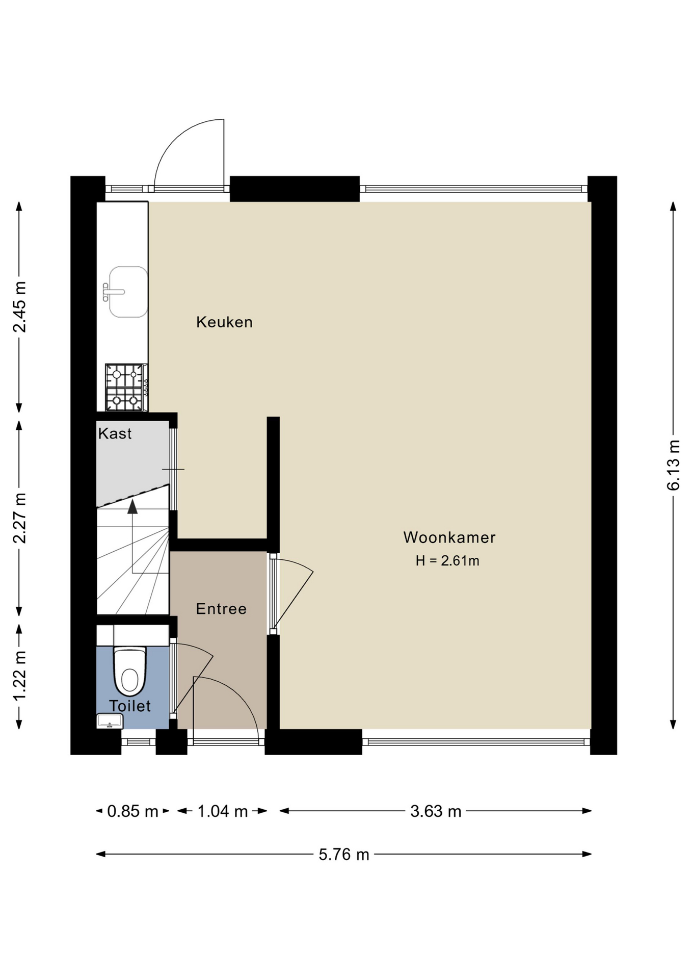 Begane grond: entree, hal met trapopgang en vernieuwd wandcloset met fonteintje. Heerlijk lichte woonkamer met laminaatvloer, dubbel glas, stucwerk plafond en grote raampartijen met uitzicht over de omgeving en de achtertuin. Halfopen keuken met een gaskookplaat, oven, vaatwasser en afzuigkap en wasmachine-aansluiting. Verdiepte provisiekast met meterkast. Vanuit de keuken heeft u toegang tot achtertuin met een royaal terras , ruime vrijstaande stenen berging en achterom.