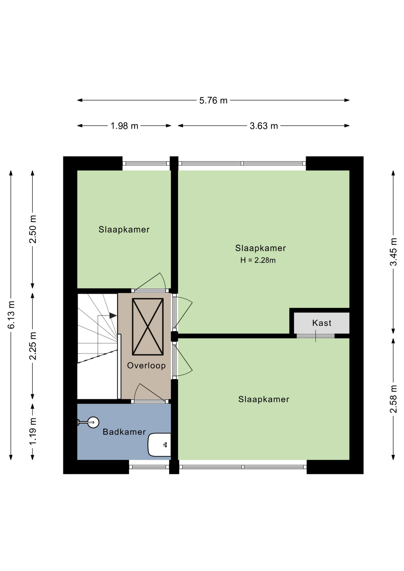 Eerste verdieping: overloop met vlizotrap naar de tweede verdieping. Drie goed bemeten slaapkamers waarvan een kamer met vaste kast. Gerenoveerde geheel betegelde badkamer met douche en vaste wastafel.