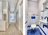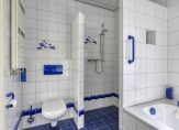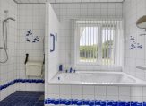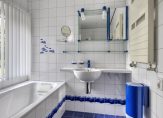 De badkamer is niet alleen heel ruim, maar ook heel licht. Witte wandtegels met blauwe motieven zijn gecombineerd met blauwe vloertegels en andere accenten in dezelfde kleur. De ruimte is optimaal ingedeeld met een ligbad, inloopdouche, tweede toilet en een wastafel.