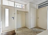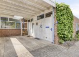 Bij de carport ziet u niet alleen de voordeur, maar ook het keukenraam en een deur naar de berging. Via de voordeur is de ruime hal te bereiken, met de garderobe en de toiletruimte aan de linkerzijde.