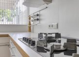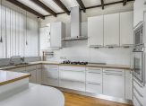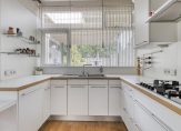 In de keuken staat een mooie Bulthaup-opstelling met een halfhoge servieskast en een vaste ontbijttafel. Deze keuken, geplaatst in 2000, biedt veel bergruimte en de gaskookplaat met wokbrander, de afzuigkap, oven, magnetron, koelkast en vaatwasser zijn ingebouwd. Voor extra bergruimte en de wasapparatuur zijn er twee bergingen, aan de voorzijde van de bungalow. Een van deze ruimtes, met een eigen entree en een bergvliering, is in gebruik geweest als bijkeuken/wasruimte.