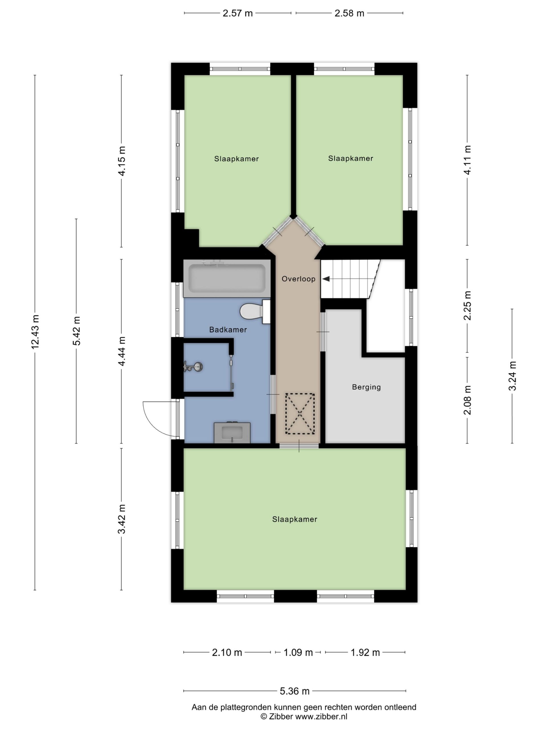 Op deze verdieping bevinden zich drie slaapkamers en een comfortabele badkamer van 9 m², voorzien van een ligbad, toilet, douche en wastafel. De slaapkamer aan de voorzijde heeft een afmeting van 5,36 x 3,42 m. De beide slaapkamers aan de achterzijde hebben een afmeting van ca. 2,57 x 4,11 m. Tevens is er een extra kamer welke gebruikt kan worden als berging.