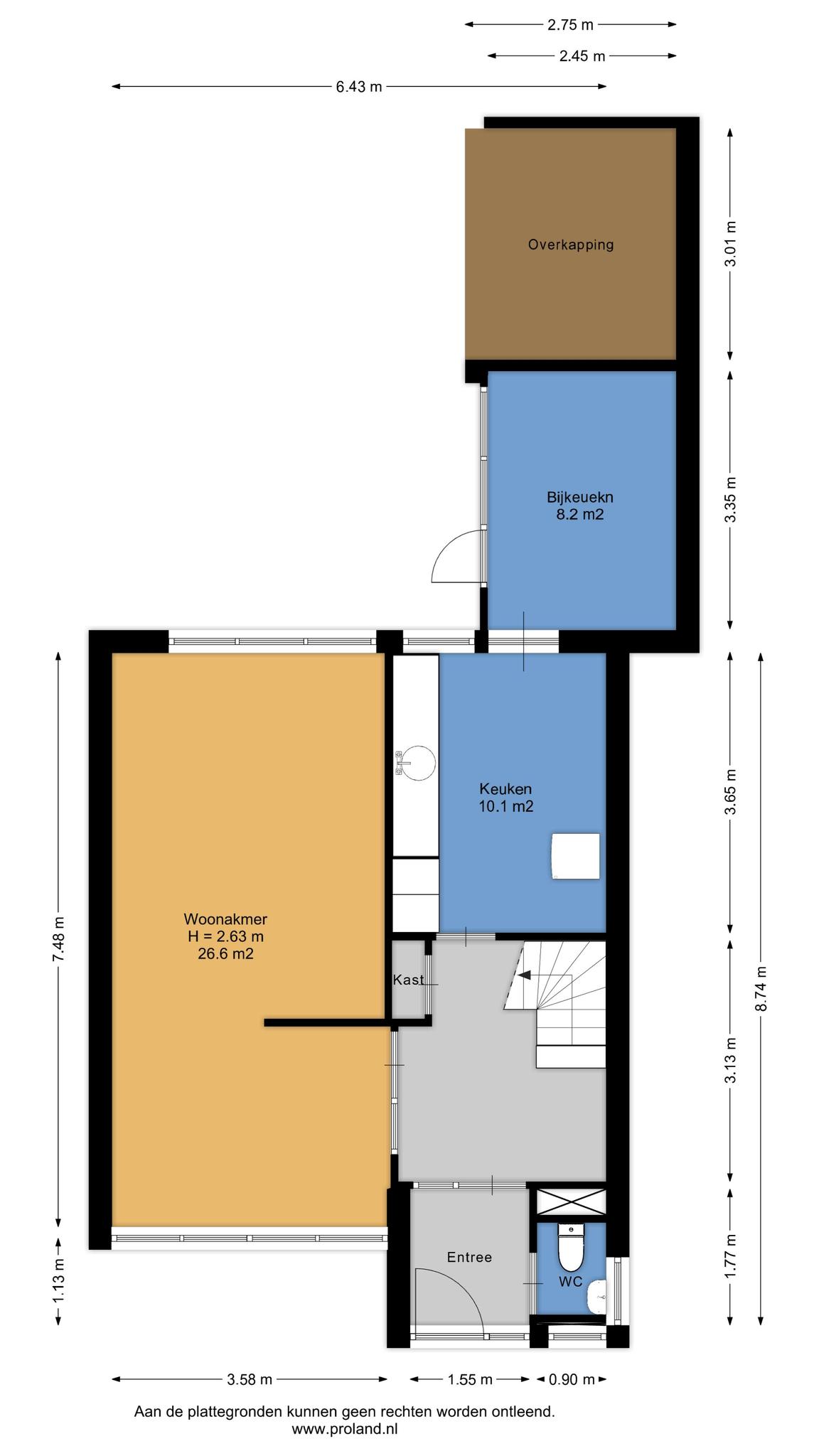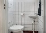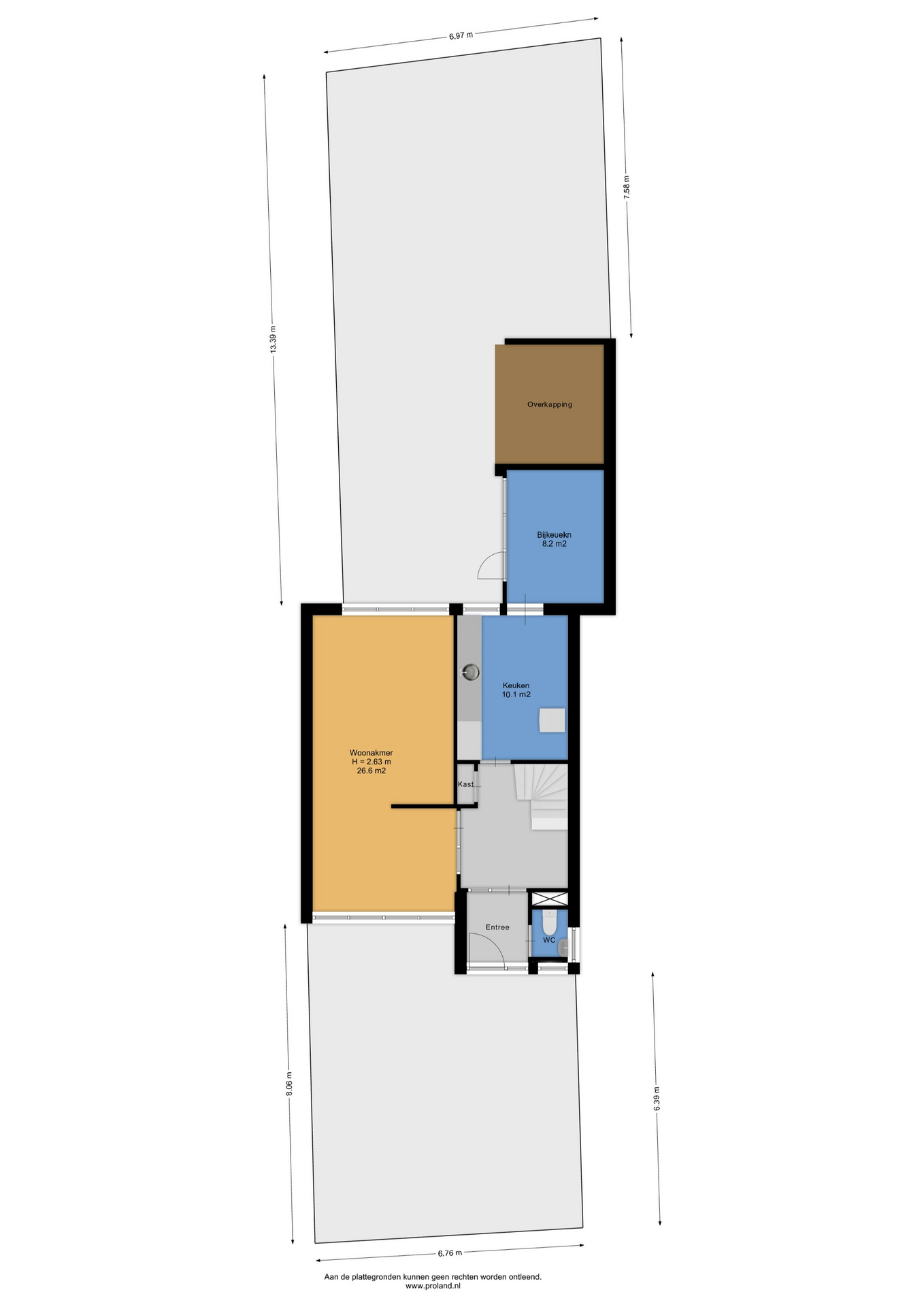 Ruime ontvangsthal met meterkast en trapopgang; betegelde toiletruimte, keukenruimte met eenvoudige keuken met toegang tot de bijkeuken, doorzon woonkamer.
