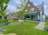 De riante achtertuin is toegankelijk via zowel de serre als de inpandige garage. De tuin is netjes onderhouden en praktisch ingedeeld. Er is een groot grasveld, ideaal voor kinderen om te spelen of om lekker te ontspannen. Rondom het gras staan planten en bloemen die zorgen voor kleur en sfeer. Een bijzonder detail is de koi-vijver met glazen wand. Hierdoor kunt u de vissen van dichtbij zien zwemmen. Verder zijn er meerdere terrassen in de tuin, met genoeg ruimte voor een grote eettafel en een loungehoek. Vanuit de tuin is een tuinhuis bereikbaar voorzien van een keukenblok met gootsteen.