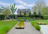 Aangrenzend aan de keuken bevindt zich een praktische bijkeuken/berging, welke is voorzien van een wand vol opbergruimte. Vanuit deze bijkeuken heeft u toegang tot de inpandige garage van circa 8,27 x 4,47 m, waar tevens de filterinstallatie van de vijver is ondergebracht. Mocht u liever een zwembad hebben in plaats van een vijver, dan is dat eenvoudig te realiseren. Onder de vijver zijn schutpijpen aangelegd naar de garage, waardoor de bestrating en beplanting intact kunnen blijven.
