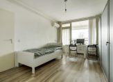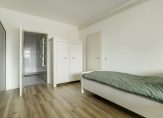De ruime slaapkamer van circa 5,21 x 3,25 m is toegankelijk vanuit de woonkamer en beschikt over een airco-unit. Daarnaast biedt de slaapkamer direct toegang tot het balkon (loggia), wat zorgt voor een fijne verbinding met buiten. Aangrenzend aan de slaapkamer is de badkamer gelegen, welke is voorzien van een inloopdouche, wastafel met meubel, designradiator en de aansluitingen voor de wasapparatuur.