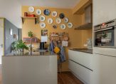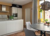 De halfopen keuken is in 2018 volledig vernieuwd en voorzien van een vaatwasser, inductiekookplaat, natuurstenen werkblad en veel opbergruimte.