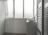 De moderne badkamer heeft daglicht, goede ventilatie, een inloopdouche, wastafelmeubel en een handdoekradiator en is volledig voorzien van tegels.