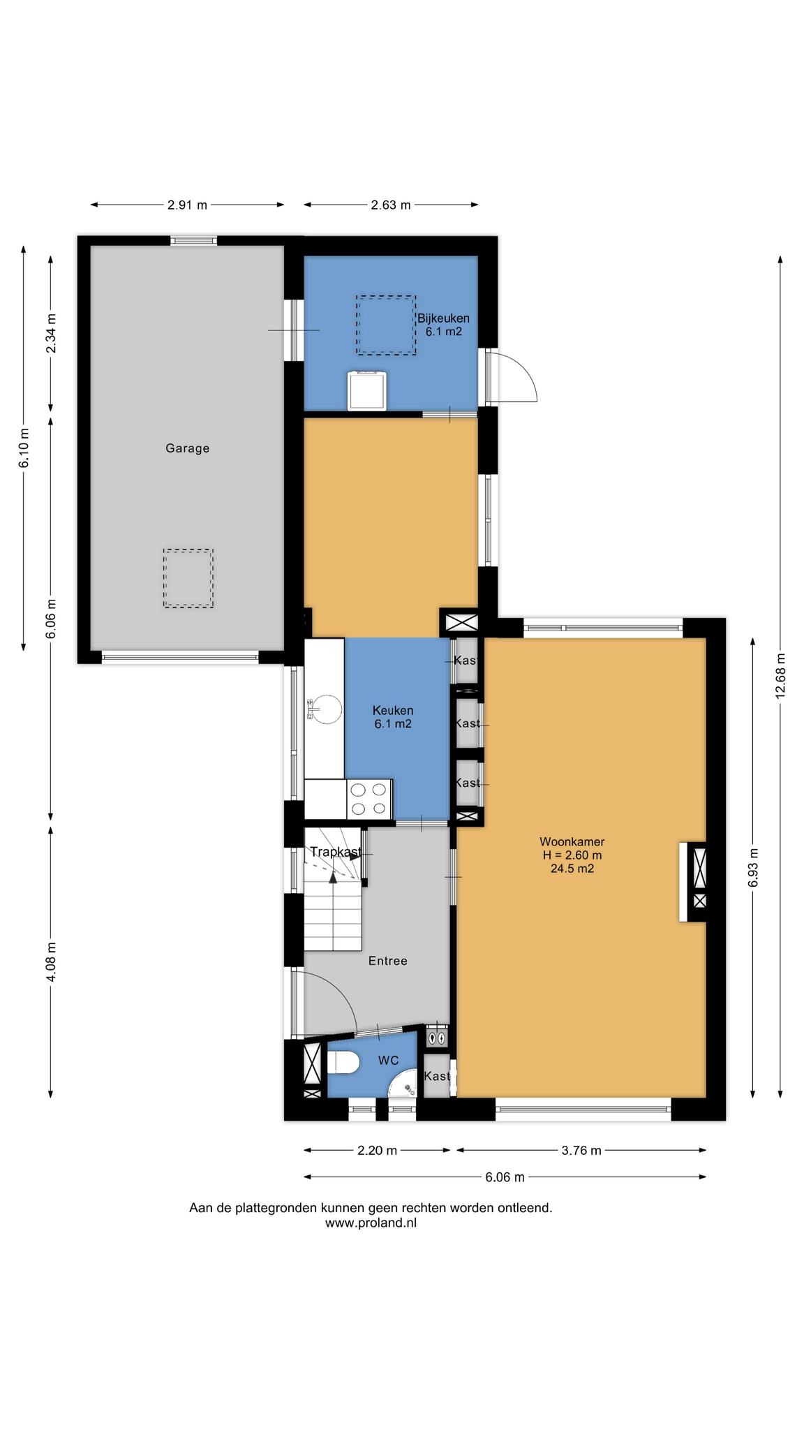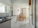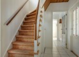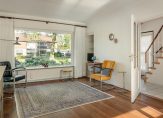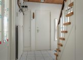 Zij-entree, hal met trapopgang, provisiekelder, toilet, keuken met vaste kastenwand, bijkeuken met toegang tot de achtertuin en tot de garage met elektrische deur, ruime woonkamer (24 m2) met uitzicht op de brede groenstrook.