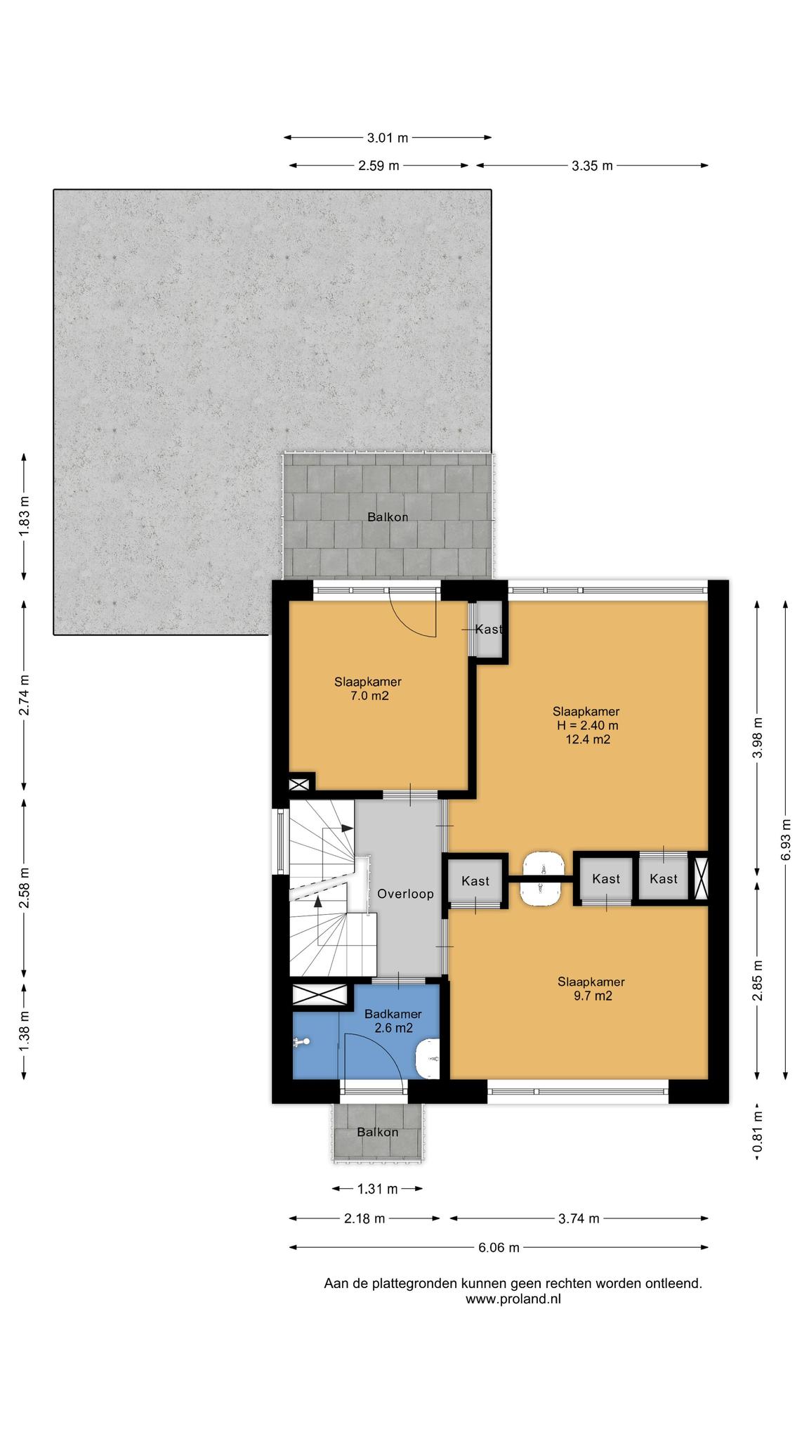 overloop, 3 slaapkamers (resp. 7, 10 en 12 m2) alle drie met vaste kasten en twee met wastafel en de derde slaapkamer met deur naar het platdak, badkamer met douche, wastafel en deur naar het balkon.