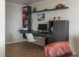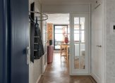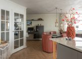 De ruimtes worden gescheiden door hoge glazen deuren. De vloer is voorzien van een fraaie pvc-vloer.