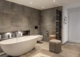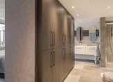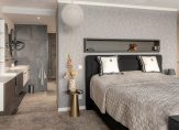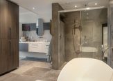 Via deze hal is er toegang tot de zeer ruime slaapkamer en de aaneengesloten royale badkamer met dubbele wastafel, douchecabine, vrijstaand ligbad en toilet.