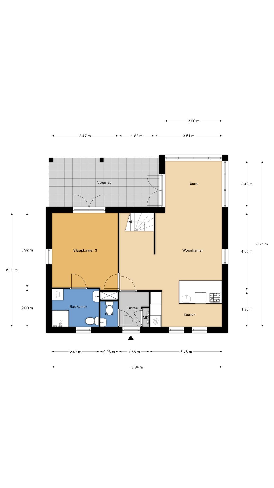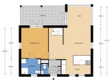 Begane grond: entree, hal met meterkast en toiletruimte voorzien van wandcloset en fontein, tuingerichte woonkamer van circa 30m2 met openslaande deuren naar de veranda en open keuken aan de voorzijde met luxe keukenopstelling voorzien van kookeiland met composiet werkblad en kastenwand voorzien van Siemens inbouwapparatuur. Tevens treft u op de begane grond een royale slaapkamer van circa 15m2 met openslaande deuren naar de veranda en een badkamer voorzien van douche, wandcloset, wastafel en witgoedaansluitingen aan.