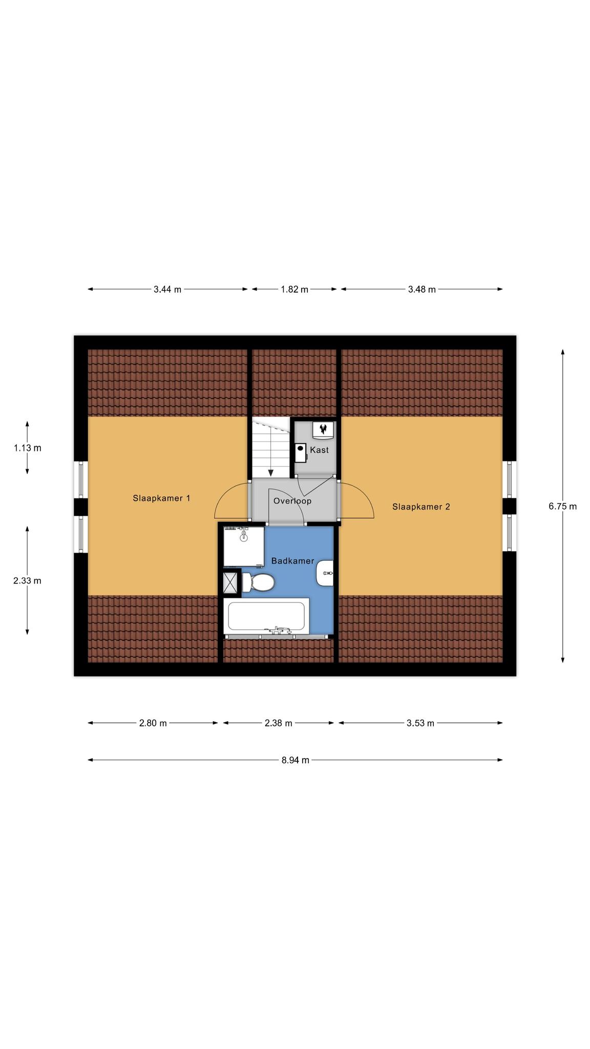 Verdieping: overloop, berging met cv ketelopstelling, 2 royale slaapkamers van beide circa 15m2 en 2e badkamer voorzien van ligbad, douche, wandcloset en wastafel.