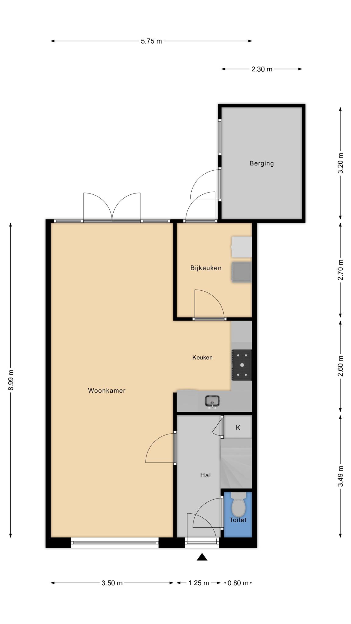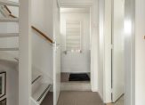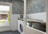 Begane grond: overdekte entree, hal met toilet en meterkast. De lichte doorzonwoonkamer heeft een open keuken en openslaande deuren naar de diepe, zonnige achtertuin met stenen berging. Vanuit de keuken bereik je de praktische bijkeuken met aansluitingen voor wasmachine en droger.