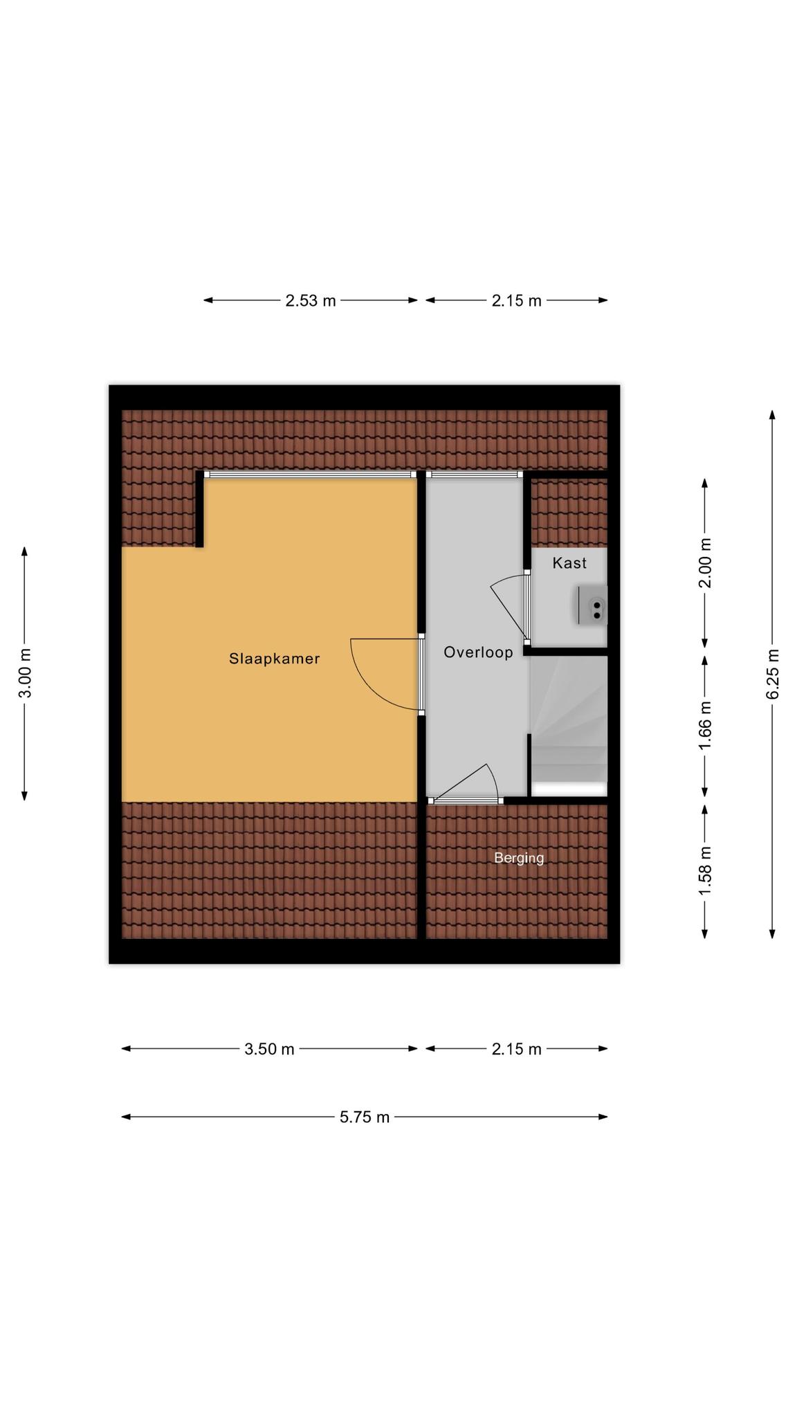 Zolder: vaste trap naar een royale vierde slaapkamer met dakkapel en extra bergruimte.