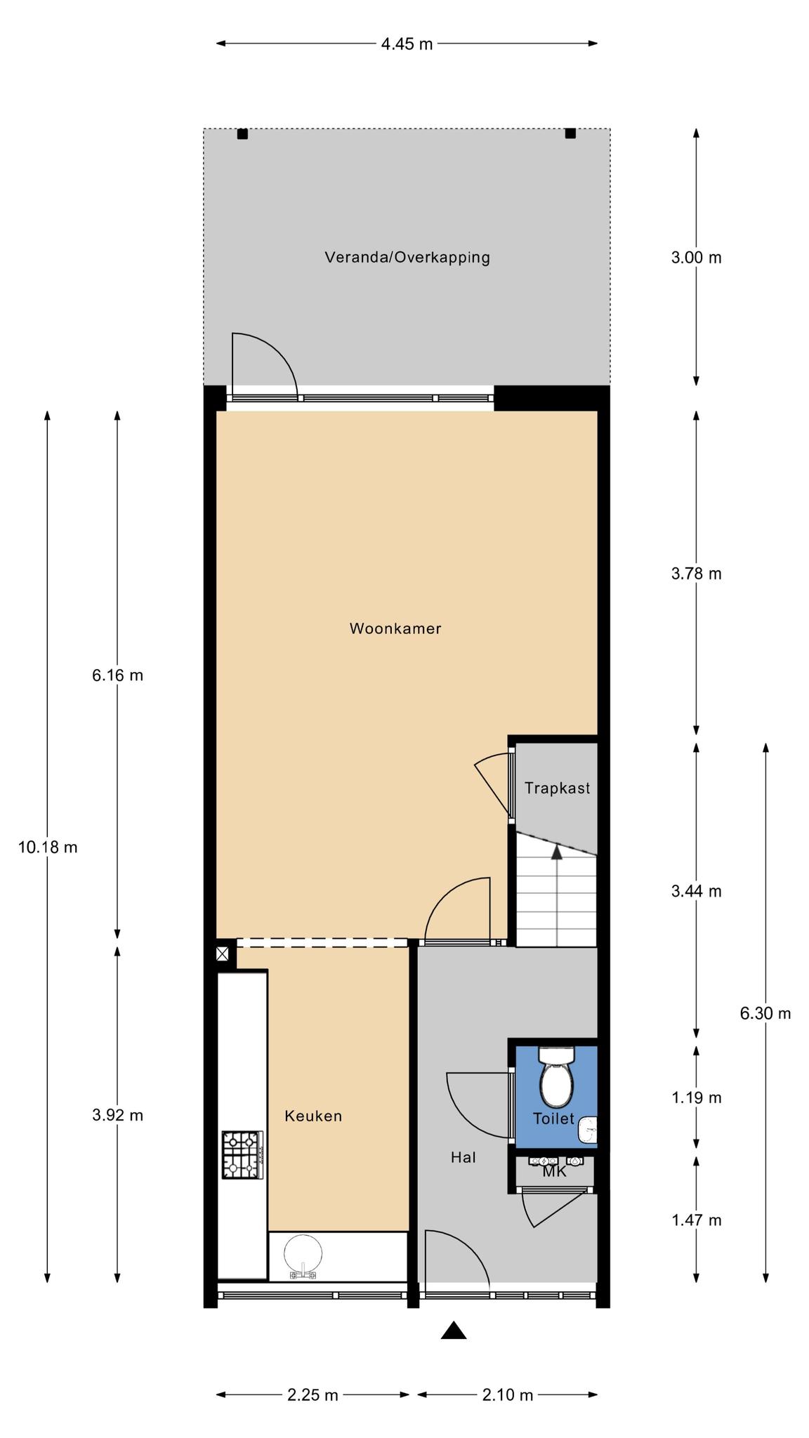entree, hal, meterkast, toilet, trapopgang naar verdieping, sfeervolle tuingerichte woonkamer met trapkast en achter entree, overkapping, moderne open keuken voorzien van alle gangbare apparatuur.