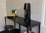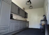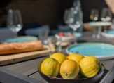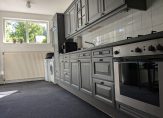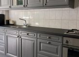 – Keuken in eigentijdse kleurstelling met voldoende kastruimte en ruimte voor bistro set voor bijvoorbeeld een snel ontbijtje in de zon