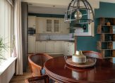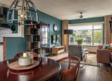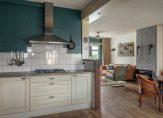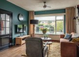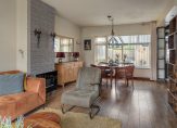 De lichte woonkamer vormt samen met de open keuken (in L-opstelling) een gezellige leefruimte.