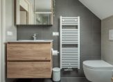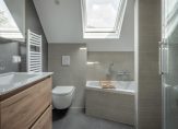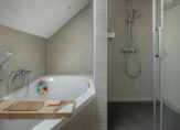 1e verdieping: overloop, 2 slaapkamers aan de achterkant (met de hoge goothoogte, dus rechte wanden) 1 slaapkamer aan de voorkant met royale dakkapel en gemoderniseerde badkamer voorzien van bad, ruime douche, toilet en wastafelmeubel.