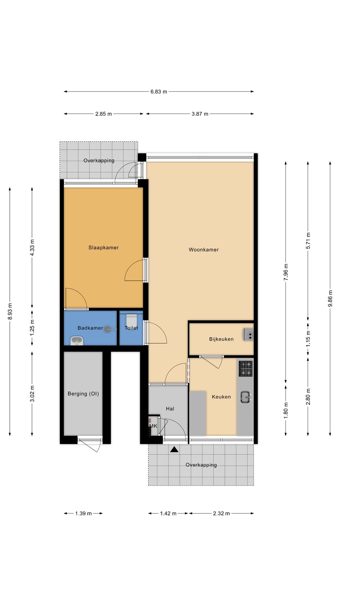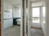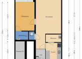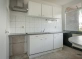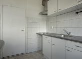 hal, keuken met bijkeuken-kast, woonkamer met deur naar terras, badkamer met douche en toilet, slaapkamer met deur naar terras.