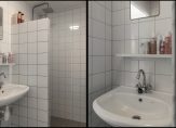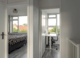 Overloop met toegang tot vier slaapkamers en een nette badkamer met douche en wastafel.
