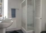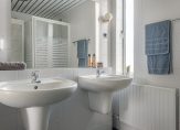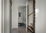 Overloop met toegang tot drie ruime slaapkamers, waarvan twee zeer royaal van formaat. De badkamer is netjes afgewerkt en voorzien van een douche, dubbele wastafel en tweede toilet.