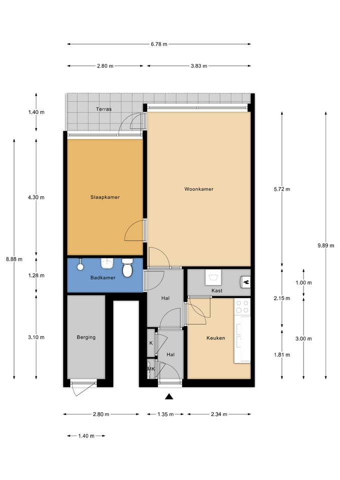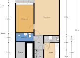 entree, hal, meterkast, keuken met witgoedaansluting en provisiekast met cv-opstelling, badkamer voorzien van toilet, douche en wastafel, woonkamer met deur naar buiten en ruime slaapkamer.