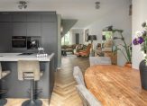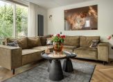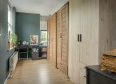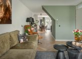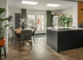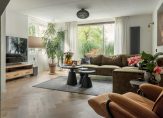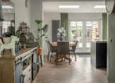 Bij binnenkomst in de woning via de zij-entree, treft u een nette hal met een gemoderniseerd toilet. De ruime woonkamer is voorzien van een stijlvolle visgraat PVC-vloer en biedt toegang tot een moderne woonkeuken, compleet met een kookeiland. Dankzij de aanbouw geniet u van een royale ruimte, waarbij de openslaande tuindeuren de tuin naadloos met de woonkamer verbinden.