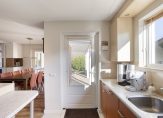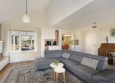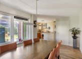 – woonkamer met grote raampartijen, pelletkachel en en-suite deuren naar de keuken;