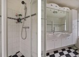 – badkamer met douchecabine, badkamermeubel met dubbele wastafel en hangend toilet.