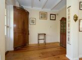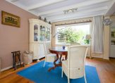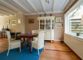 De woonkamer strekt zich uit over de voor- en achterkant van het huis en biedt een prachtig uitzicht op de landerijen en bloemenperken. Grote ramen laten veel daglicht binnen, terwijl de houten vloer en strakke plafonds een uitnodigende en authentieke sfeer creëren. Het is de ideale plek om te ontspannen en te genieten, compleet met een mooie houtkachel. De ruime vensterbanken benadrukken de karakteristieke sfeer. Dankzij de uitstekende verwarming is de woonkamer snel comfortabel, en zelfs bij warm weer blijft het er verrassend koel.