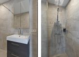 Slaapkamer 1 met PVC vloer, stucwerk wandafwerking en rolluik. Volledig betegelde badkamer met hangcloset, inloopdouche, wastafel met meubel, inbouwspots en afzuiging.