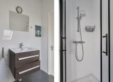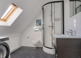 Volledig betegelde badkamer met Velux dakraam. De badkamer is voorzien van een douche (Douchecabine, 2024), wastafel met meubel en een hangcloset. De aansluitingen voor de wasmachine bevindt zich in de badkamer.