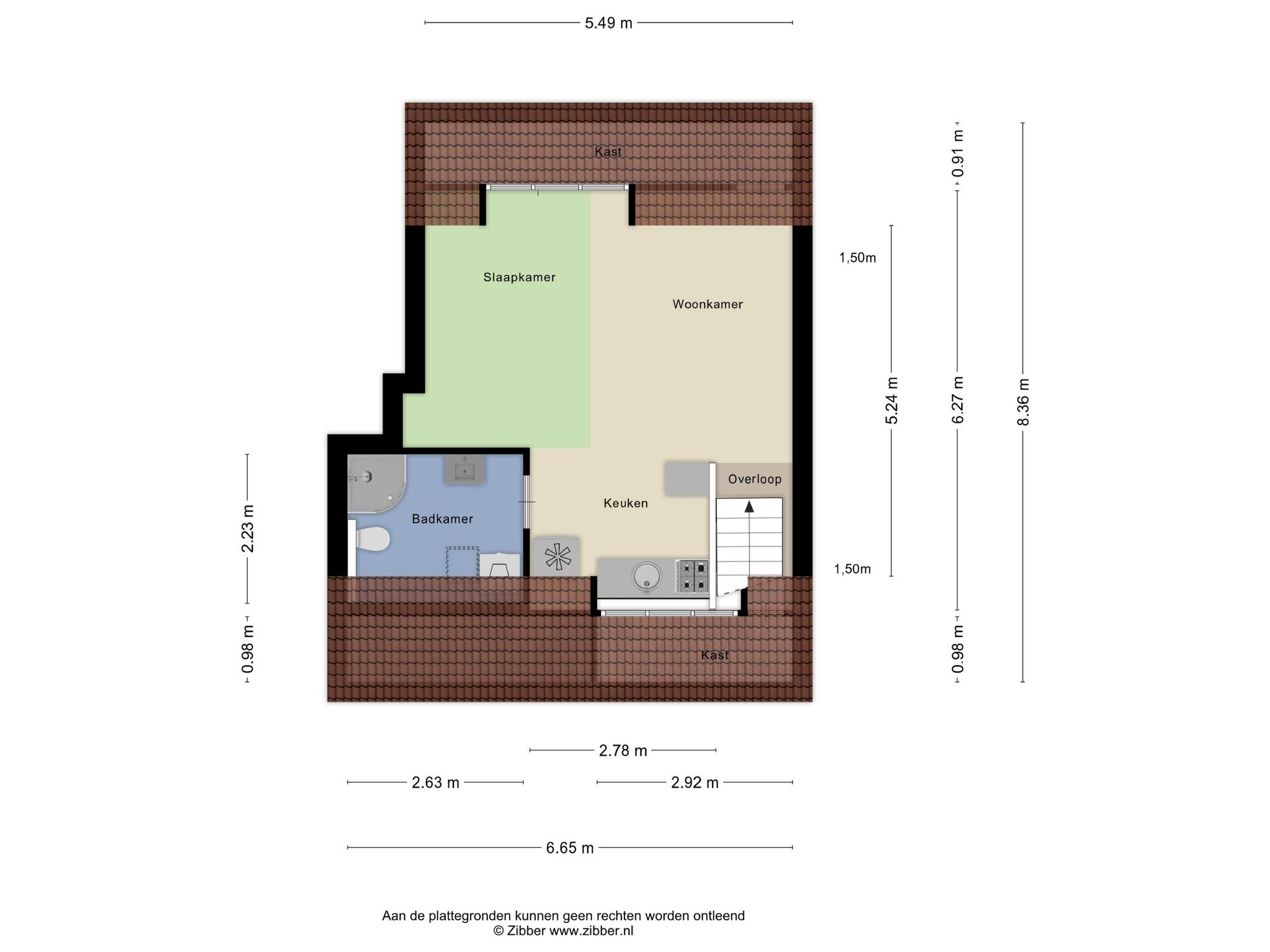 Ruime, open ruimte met laminaat vloer, flinke dakkapel aan zowel de voor- als de achterzijde en stucwerk wandafwerking. De prachtige draagconstructie in zichtbaar wat een speciaal effect geeft in de woning. Open woon- en slaap gedeelte welke door de constructiebalken in te delen is in ruimtes. Bergruimte achter knieschot. Open keuken (2014) aan de achterzijde met inbouwappartuur; 4-pits gasfornuis, afzuigkap, vaatwasser en verschillende opbergkastjes en lades.