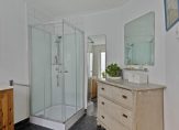 Overloop met tapijt vloer en stucwerk wandafwerking. Slaapkamer 1 aan de voorzijde met vinyl vloer en stucwerk wandafwerking. Slaapkamer 2 aan de voorzijde met laminaat vloer en stucwerk wandafwerking. Badkamer aan de achterzijde met douche, toilet (2024) en wastafel met meubel. De douchecabine is vernieuwd in 2024.