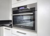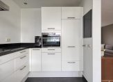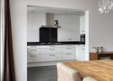 In 2009 vernieuwde, half open keuken aan de achterzijde. De keuken is voorzien van een tegelvloer met elektrische vloerverwarming, stucwerk wandafwerking en inbouwspots. U-vormige keukenopstelling met diverse inbouwapparatuur; vaatwasser (2023), 5-pits gasfornuis, afzuigkap, combi oven/magnetron (2020), koelkast en verschillende opbergkasten en lades.