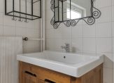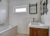 Deels betegelde badkamer aan de voorzijde met ligbad met douche gelegenheid, een wastafel met meubel en ventilatie.