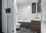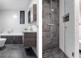 Volledig betegelde badkamer aan de voorzijde met ligbad, hangcloset, douche, wastafelmeubel, decorradiator en afzuiging.