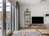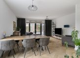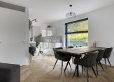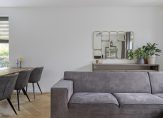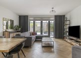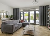 Lichte en ruime woonkamer met visgraat PVC-vloer, stucwerk wandafwerking en praktische trapkast. Openslaande tuindeuren naar de achtertuin. Dankzij de grote raampartijen baadt deze woning in het daglicht, wat zorgt voor een heerlijk lichte en open sfeer.