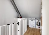 Overloop met laminaat vloer, stucwerk wandafwerking en wastafelmeubel. Hier bevinden zich de aansluitingen voor wasapparatuur en de unit van de mechanische ventilatie. Bergruimte achter knieschotten.