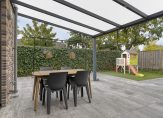 De tuin loopt door naar de zijkant, waar zich nog een groot stuk tuin bevindt. Verdeeld in twee delen (beide afgesloten met een poort) en volledig bestaat: echt een verlening van de tuin. Wat zeker genoemd mag worden is dat de tuin volop privacy biedt en omringd is door groen!