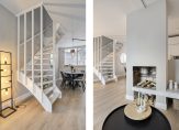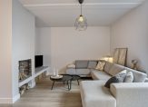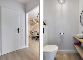 Hallway with PVC flooring, plastered wall finish, and wardrobe niche. The underfloor heating unit (2024) is located here. Meter cupboard renewed in 2024 with 12 circuits, 3 residual-current devices, and fibre-optic connection. Modern toilet with washbasin cabinet and wall-mounted toilet. Spacious and bright living room with PVC flooring with underfloor heating, plastered wall finish, and French doors to the backyard. The living room has a layout with a dining area at the front and a sitting area at the rear. The sitting area features a cosy fireplace. The staircase to the first floor is located in the living room.