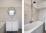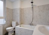 Badkamer aan de voorzijde met ligbad met douche gelegenheid, toilet en wastafel met meubel.