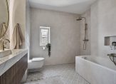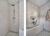 Volledig betegelde, luxe badkamer met ligbad, dubbele wastafel met meubel, hangcloset, inloopdouche en mechanische afzuiging.
